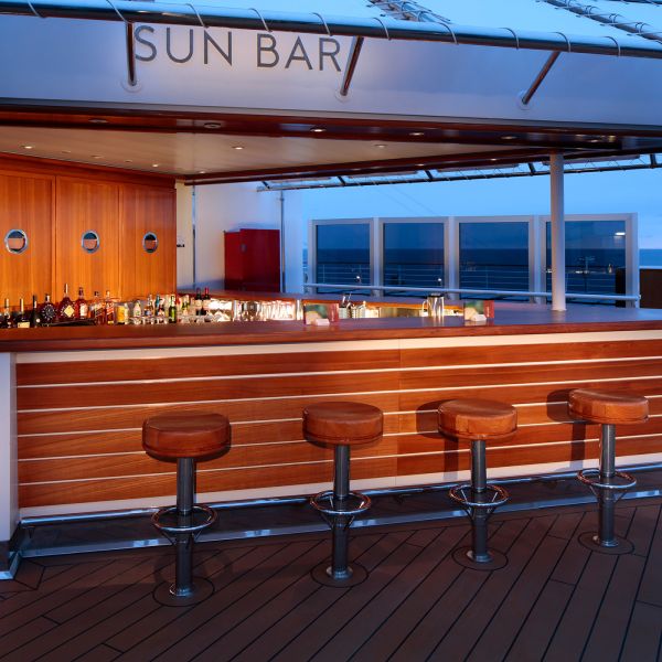 Ce bar est situé juste au-dessus du pont où se trouve la piscine et permet de prendre un verre ou commander un en-cas tout en bénéficiant d’une vue panoramique sur l’extérieur.