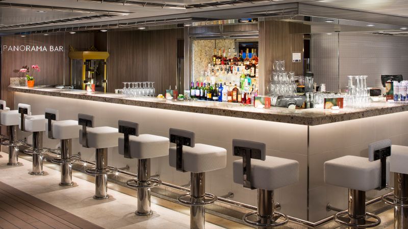 Ce bar est situé juste au-dessus du pont où se trouve la piscine et permet de prendre un verre ou commander un en-cas tout en bénéficiant d’une vue panoramique sur l’extérieur.