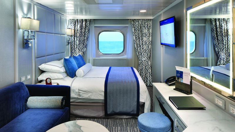 Un hublot classique laisse entrer la lumière et éclaire le décor remarquablement rénové de ces cabines pratiques de 15 mètres carrés, conçues avec goût pour maximiser l’espace. Profitez d’un coin salon confortable avec un canapé pour vous détendre, ainsi que d’une coiffeuse, d’une table de petit-déjeuner et d’un mini-bar/réfrigérateur.