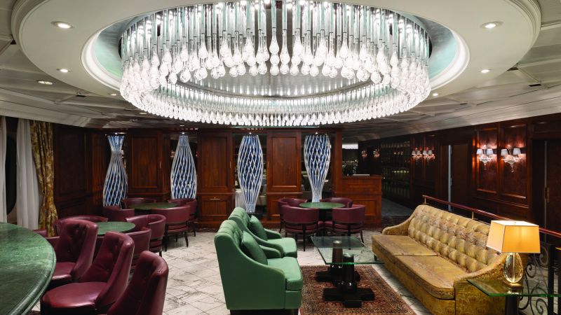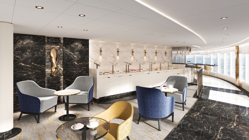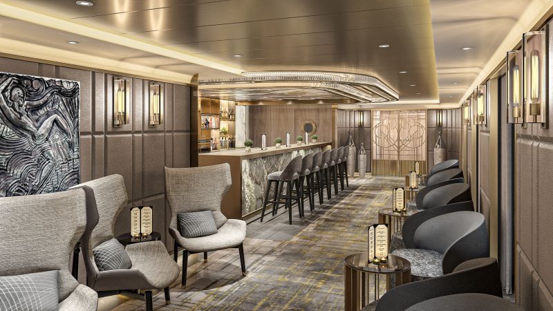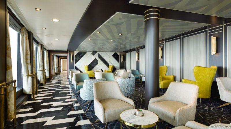 Tel un club privé, le Grand Lounge présente des alcôves épurées mises en valeur par une palette de couleurs chaudes, un éclairage sculptural et des lignes élégantes. C'est un salon à la fois chic et relaxant qui invite les passagers à se détendre avant un fabuleux dîner ou à prendre un dernier verre avec d'autres voyageurs.