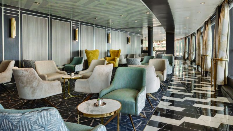 Avec ses larges baies vitrées, le salon Horizons est le salon d’observation à bord, pour profiter des paysages tout en sirotant un verre dans un cadre élégant et une ambiance décontractée.