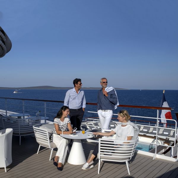 • à bord de notre trois-mâts Le Ponant : Solarium de 400 m², marina, salon, boutique & espace loisirs