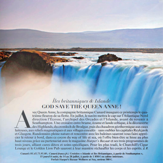 L’hebdomadaire L’Express du 29 février dernier a mis en lumière la compagnie Cunard et son nouveau navire Queen Anne dans son dossier spécial tourisme. Avec un lancement prévu début mai, Queen Anne effectuera son voyage inaugural autour des îles britanniques avec un itinéraire le long des côtes de la Grande-Bretagne, de l’Irlande et de l’Ecosse.