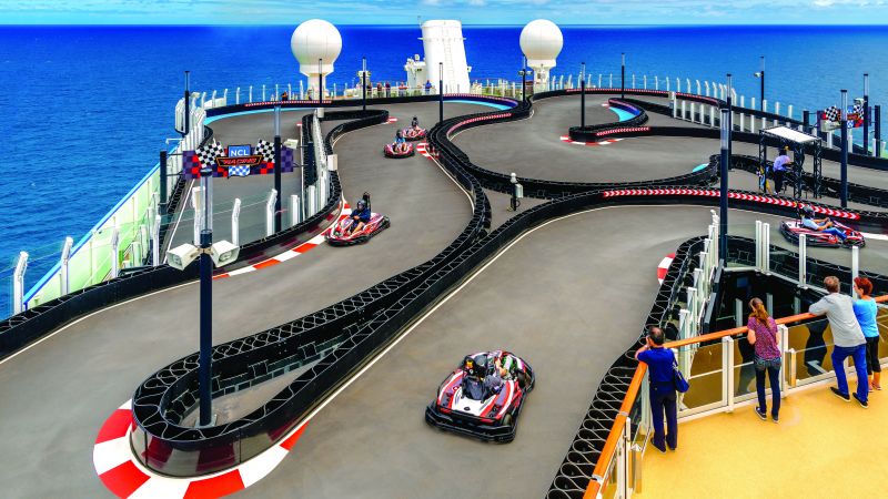 Unique en mer ! Une piste de karting avec karts électriques et sons de Formule 1 propose aux passagers des Norwegian Bliss, Norwegian Encore, du Norwegian Joy et du Norwegian Prima de faire quelques tours de piste, sur deux niveaux, au-dessus de l’océan ! Une expérience à ne pas manquer !