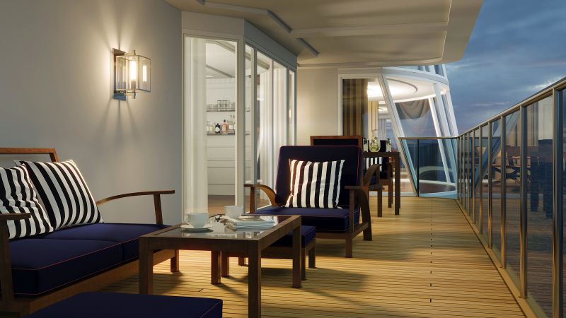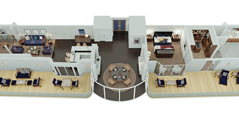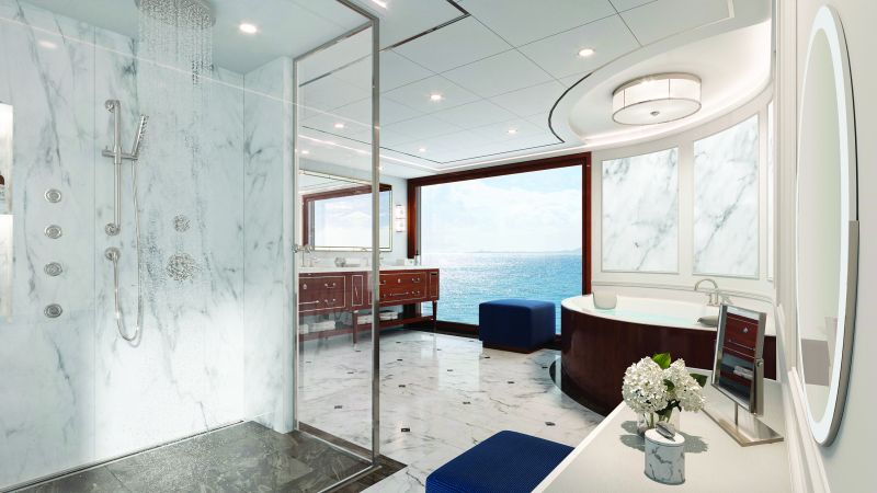 S'étendant sur toute la largeur du navire, chacune des trois Owner's Suite à bord du Vista offent une superficie de 223 m2. De grandes baies vitrées, dans chaque pièce, participent à créer une atmosphère lumineuse. Ces suites ont été conçues exclusivement par Ralph Lauren Home dans une symphonie harmonieuse de meubles et de matériaux. La pièce maîtresse de la salle à manger est une élégante table Brook Street Salon et des chaises Holbrook Director's Chairs de Ralph Lauren Home, tandis que le salon adjacent présente une approche épurée de mobilier moderne qui rappelle le nautisme. Un bar à cocktails en palissandre se tient prêt pour étancher votre soif, et une grande baie vitrée s'ouvre sur une vaste véranda en teck. La chambre principale, avec un luxueux lit king-size Côte d'Azur, est un véritable havre de paix. De grands dressings, une salle de bain avec une grande baignoire et une douche avec vue sur l'océan, complètent ce tableau idyllique.