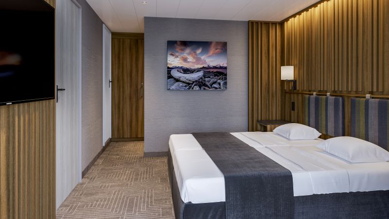 En plus des expériences extraordinaires que les passagers vivront en excursion hors du navire, ils pourront également apprécier la douceur de vie à bord de l’Ultramarine. Le navire dispose de 102 suites et cabines reparties en 9 catégories dont 6 cabines individuelles. Les suites et cabines, comme le reste des espaces publics, ont été conçues toujours dans le même esprit, rester le plus possible en lien avec la nature.