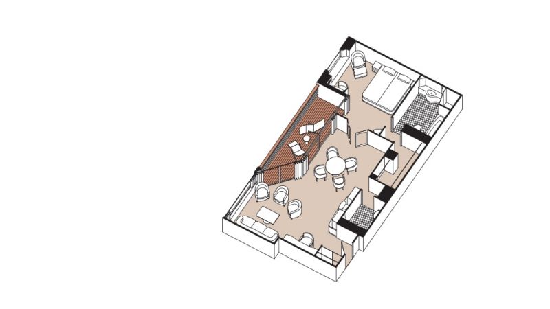 Confortablement située au milieu du navire, cette suite dispose d'une chambre spacieuse avec un lit king-size avec une literie luxueuse exclusive Slumber Bed™. Cette suite dispose également d'un grand dressing avec tiroirs. Et pour parfaire le luxe de cette suite, un majordome personnel sera à votre disposition tout au long de votre croisière