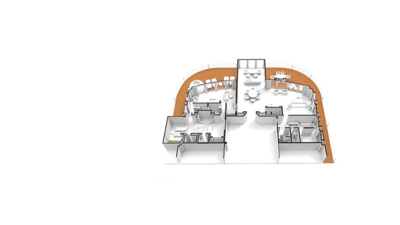 La Regent Suite est située au sommet du navire (Pont 14) et offre une vue spectaculaire sur l’océan. Un savoir-faire incomparable et une attention méticuleuse sont évidents dans chaque détail. Une réalisation unique en son genre pour un hébergement somptueux. Cette suite dispose d'une grande terrasse privée (parmi les plus grandes en mer) avec une mini-piscine, de deux magnifiques chambres, un spa, sauna et hammam dans la suite