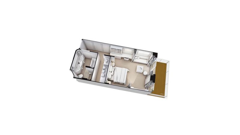 Ces suites sont un excellent choix pour les passagers qui souhaitent avoir de l’espace pour profiter de leur suite. De larges portes-fenêtres offrent une magnifique vue sur l’extérieur, et donnent accès au balcon. L’espace de vie est spacieux et comprend un coin nuit. Une luxueuse salle de bain vient compléter les aménagements de ces suites.