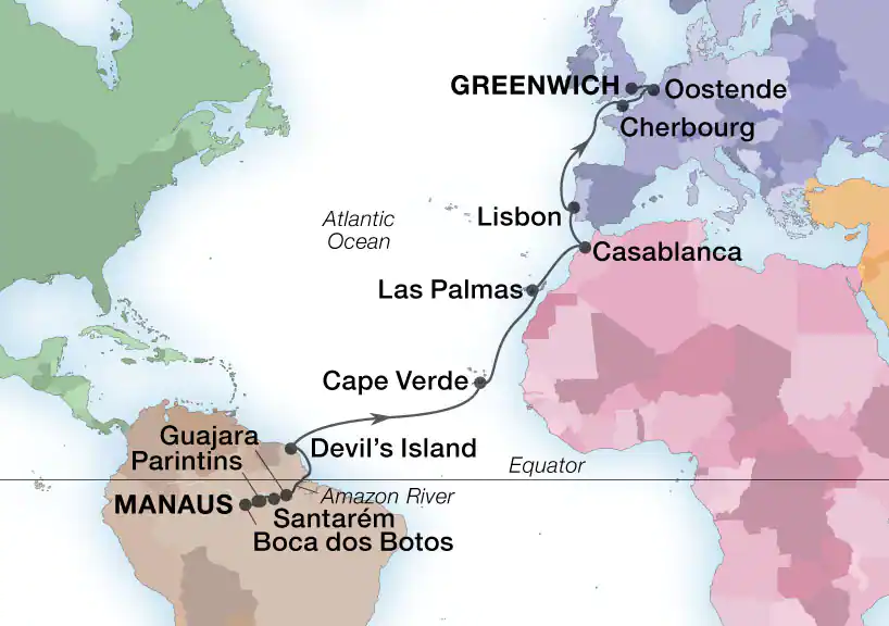 De Manaus à Londres, deux grands continents et voies navigables d'Europe occidentale
