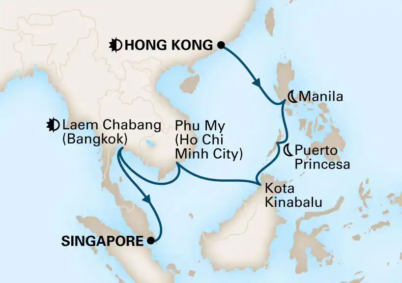 Toutes les escales et les amplitudes horaires indiquées sont données à titre indicatif et sont susceptibles d’être modifiées par les compagnies maritimes à tout moment, avant le départ ou pendant la croisière.