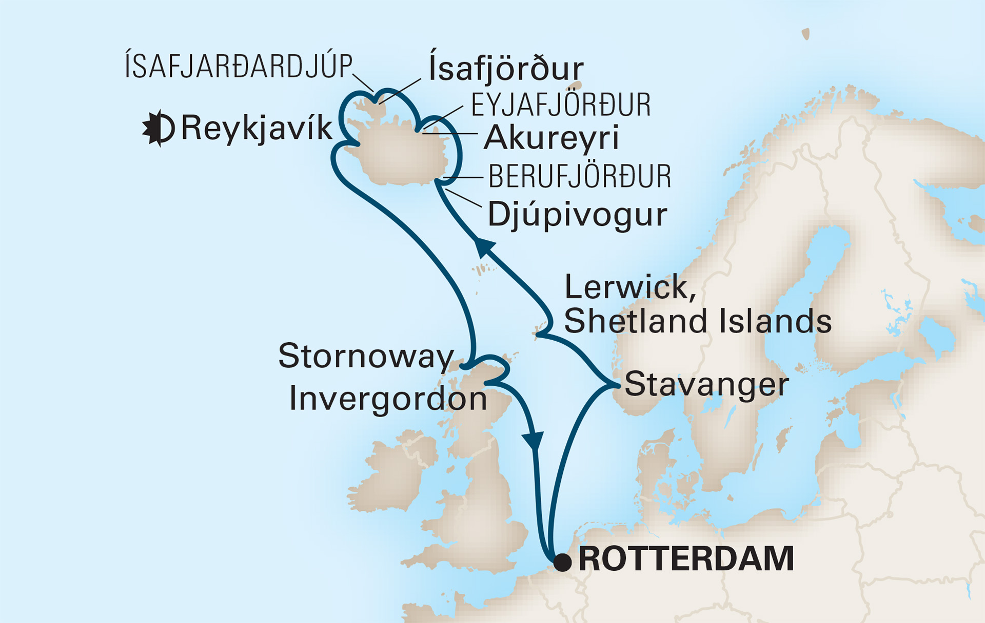 Admirez la beauté de l'île du Nord lors d'une croisière aller-retour en Europe au départ de Rotterdam. Parcourez Ísafjardardjúr et admirez les paysages islandais balayés par le vent. Explorez Reykjavik, Inverness et Stavanger.