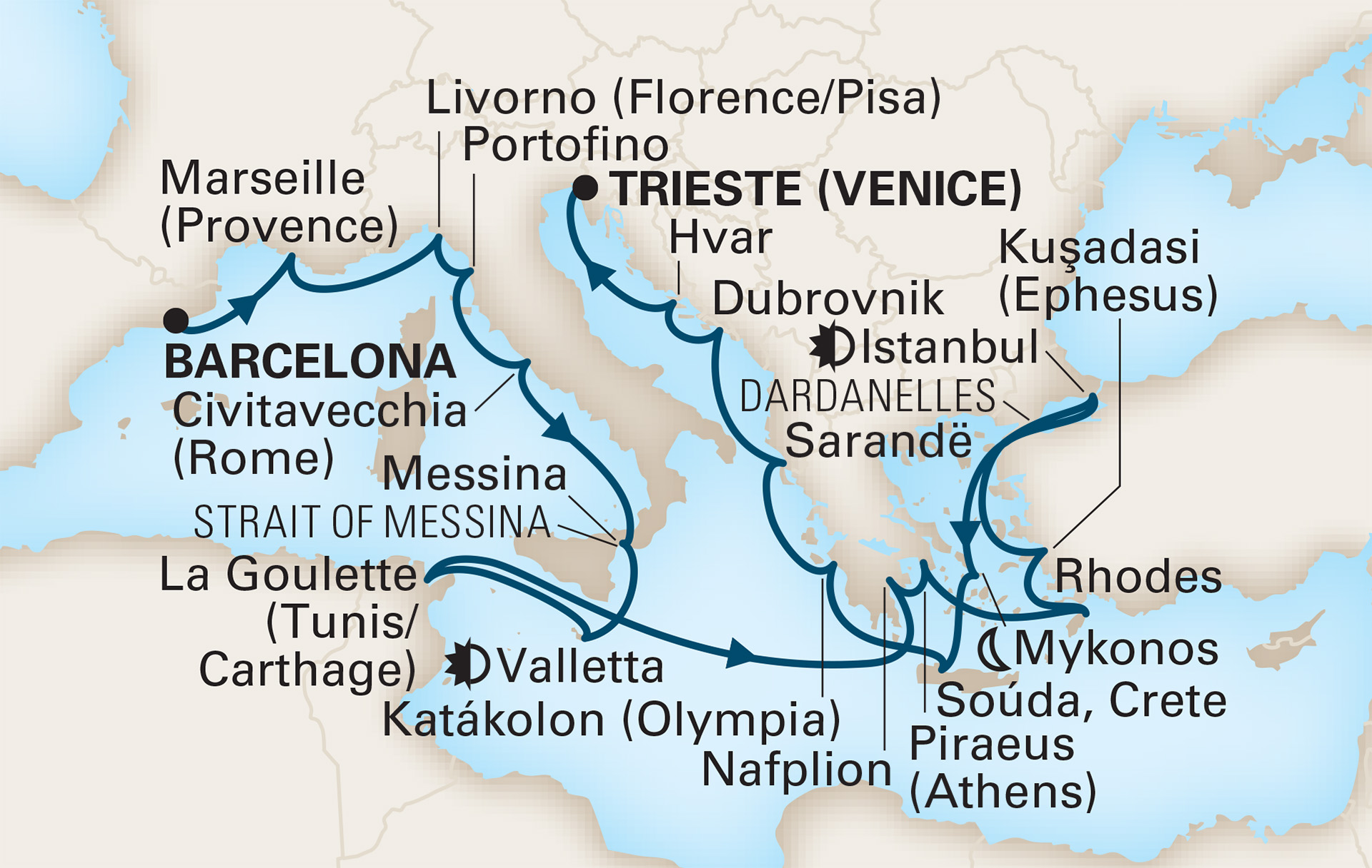 Toutes les escales et les amplitudes horaires indiquées sont données à titre indicatif et sont susceptibles d’être modifiées par les compagnies maritimes à tout moment, avant le départ ou pendant la croisière.