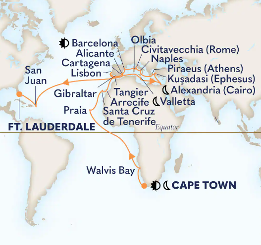 Toutes les escales et les amplitudes horaires indiquées sont données à titre indicatif et sont susceptibles d’être modifiées par les compagnies maritimes à tout moment, avant le départ ou pendant la croisière.