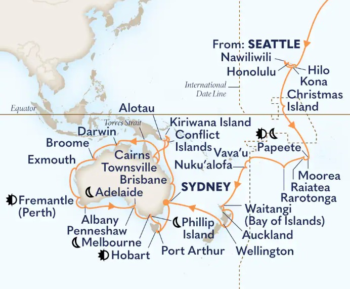 Toutes les escales et les amplitudes horaires indiquées sont données à titre indicatif et sont susceptibles d’être modifiées par les compagnies maritimes à tout moment, avant le départ ou pendant la croisière.