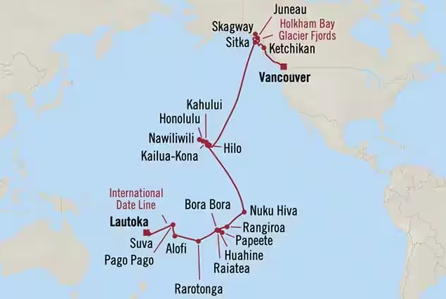 Cette croisière passe par la ligne imaginaire de changement de date. De ce fait, le nombre de jours passés à bord du bateau ne correspond pas à l'intervalle entre la date de départ et la date d'arrivée