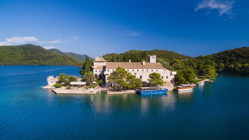 Etirée sur une quarantaine de kilomètres entre Dubrovnik et Korcula, l’île de Mljet s’épanouit en un magnifique parc naturel protégé. Une forêt de pins d’Alep y enserre le plus charmant des lacs et le plus insolite des monastères, situé sur un îlot au milieu du lac, dont l’eau fait environ 5°C de plus que celle de la mer, et qu’on peut s’y baigner dès le mois d’avril. Mljet est un ravissement des sens : une explosion de couleurs, de chants de cigales et de parfums naturels de pins, cyprès, romarin, laurier et lavande.